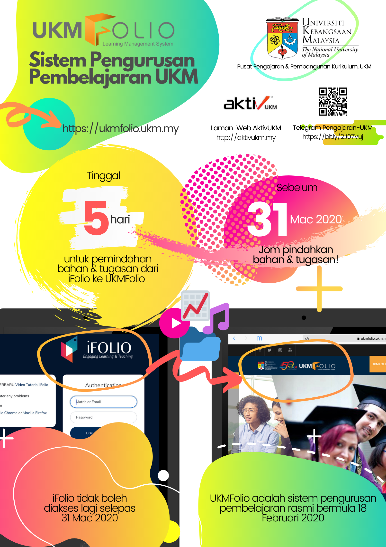 Untuk pemakluman semua, UKMFolio adalah platform pengurusan pembelajaran (LMS) rasmi UKM bermula 18 Februari 2020. Oleh yang demikian, semua warga dinasihatkan agar memindahkan semua bahan dan tugasan pembelajaran dari iFolio ke UKMFolio sebelum 31 Mac 2020. Ini disebabkan iFolio tidak boleh dicapai lagi selepas tarikh tersebut.